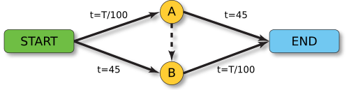 In the example below, there are four roads with commute time t specified as either constant or a linear function of the number of travelers T. Suppose there are 4000 commuters. If a and b commuters pick the top and bottom path respectively, the top path has commute time a/100 + 45 and the bottom has b/100 + 45. This is a stable system – people will switch from the top to bottom path or vice versa if there are more people taking the same route that they do in order to reduce congestion and minimize their commute time. This stabilizes at an equal commute time of 2000/100 + 45 = 65 minutes.